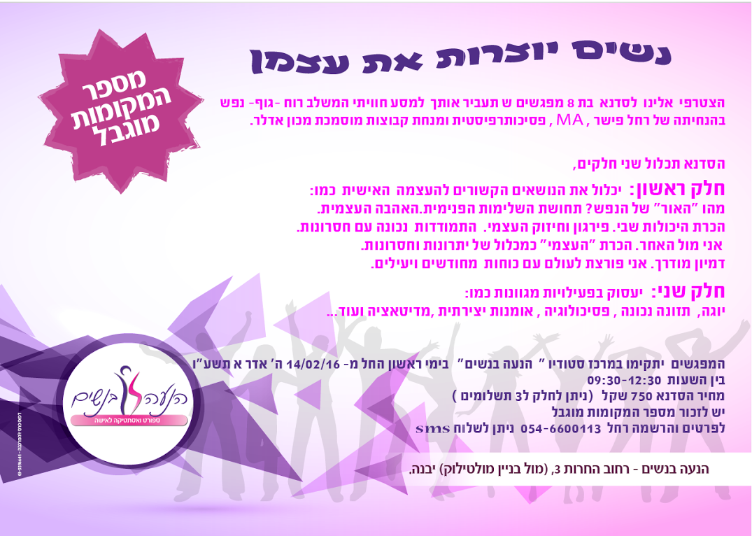 המפגשים יתקימו במרכז סטודיו "הנעה בנשים" בימי ראשון החל מ - 14/02/16 ה' אדר א תשע"ו